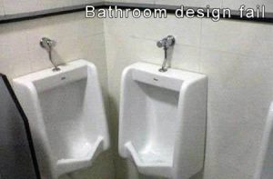 Erros de projetos, nas plantas, construção e instalação dos equipamentos sanitários absurdos, como as portas altas dos banheiros que permitem ver as pessoas sentadas por quem está fora (na primeira foto) ou mictórios na quina das paredes, tão próximos que não permitiriam duas pessoas mijarem ao mesmo tempo sem se encostarem.